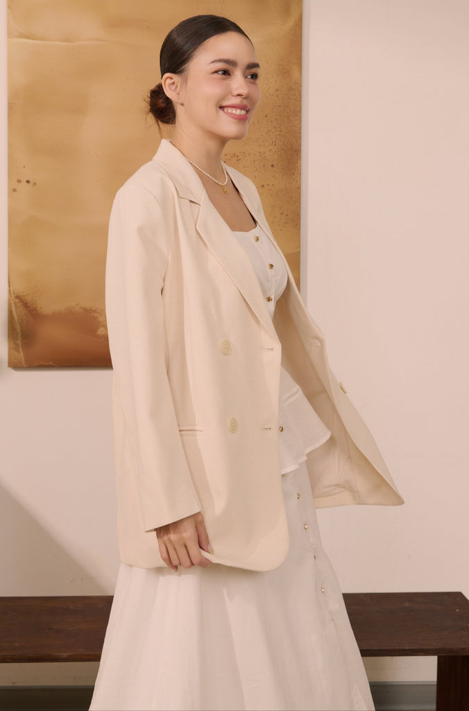 Soft power blazer in beige is backordered. We will ship it out separately after 21-30 business days.