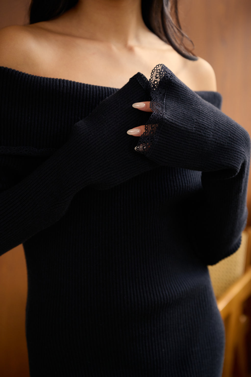 商品細節:一字領、蕾絲拼接、喇叭袖口。