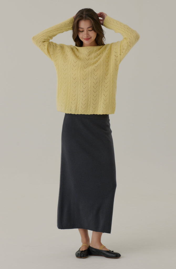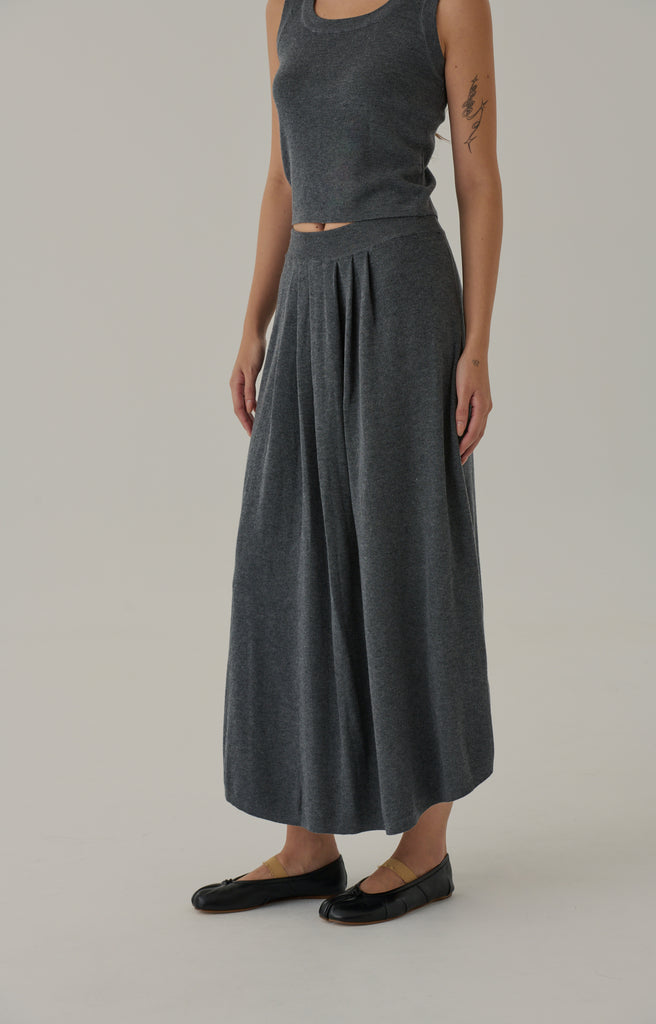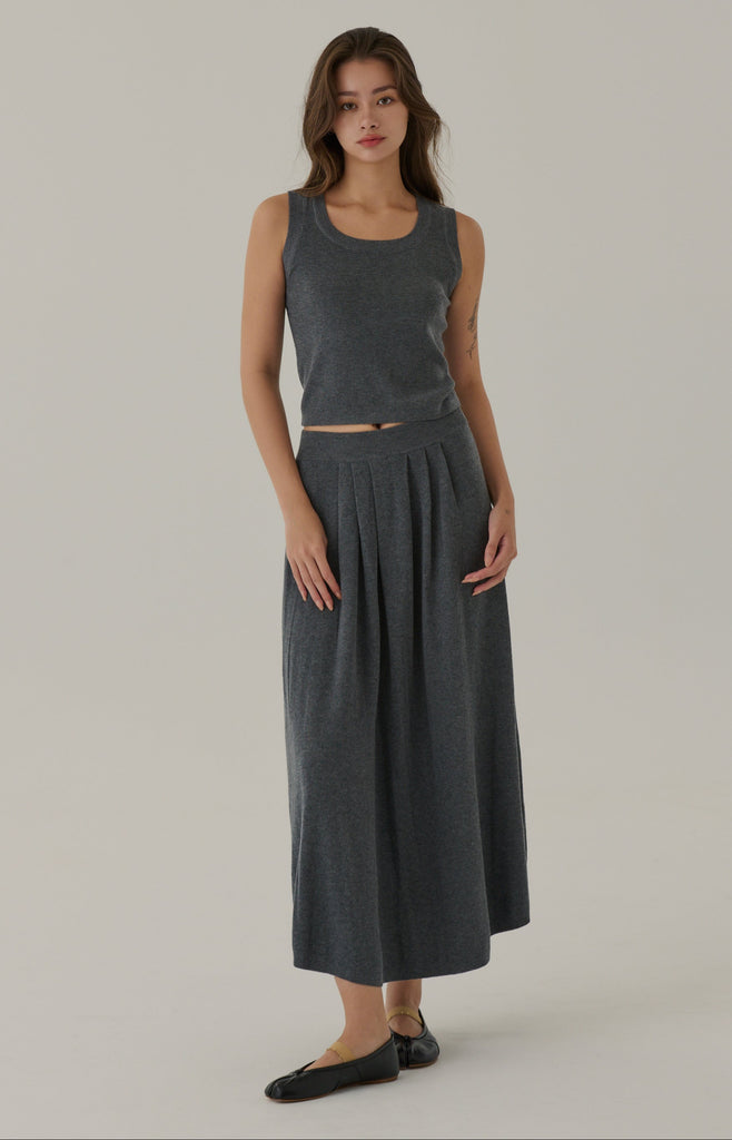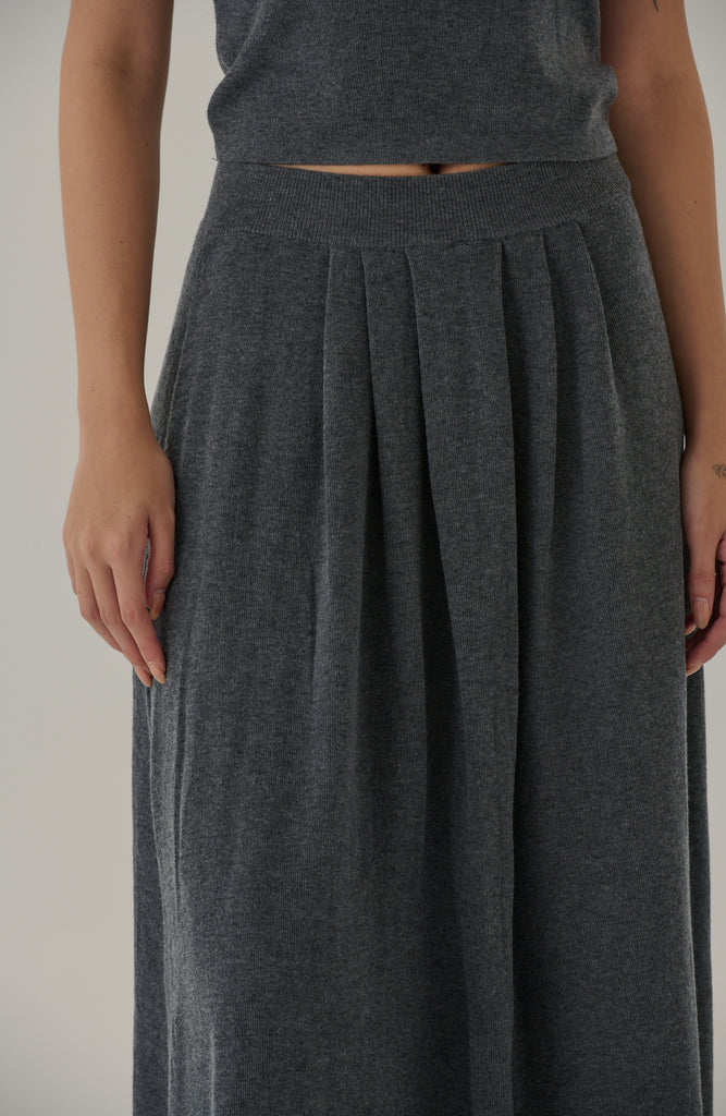 Soft drape knit skirt in grey is backordered. We will ship it out separately after 21-30 business days.
